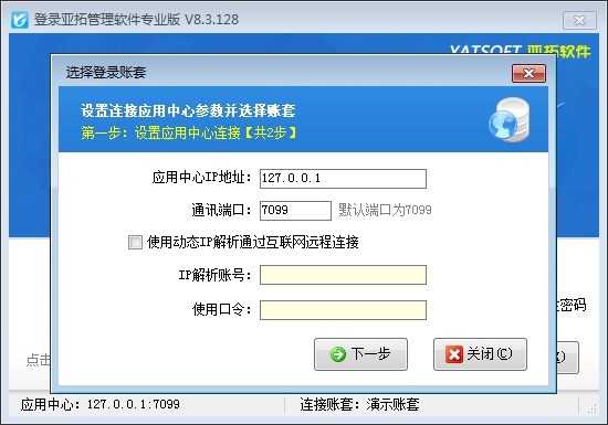 點(diǎn)擊桌面上的“亞拓管理軟件”程序(以下簡(jiǎn)稱(chēng)“客戶(hù)端程序”)圖標(biāo)(或者在開(kāi)始菜單中點(diǎn)擊程序組中的相應(yīng)功能),即可打開(kāi)客戶(hù)端程序。點(diǎn)“選擇賬套”按鈕,可以輸入“應(yīng)用中心”所在電腦(即主機(jī)電腦)的IP地址以及通訊端口,如果是通過(guò)互聯(lián)網(wǎng)遠(yuǎn)程連接請(qǐng)輸入購(gòu)買(mǎi)動(dòng)態(tài)IP解析服務(wù)后我們提供的IP解析帳號(hào)和使用口令,然后點(diǎn)“下一步”按鈕,選擇要登錄的賬套。