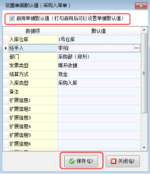 在“設置單據默認值”窗口,勾選“啟用單據默認值”,選擇需要設置的默認值后點擊“保存”按鈕進行保存。再次新增采購入庫單時,單據主體上面會直接顯示設置好的數據項默認值,如圖4所示。