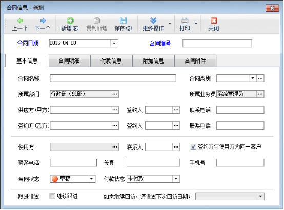 合同信息包括基本信息、合同明細(即采購或銷售的商品明細、服務明細等)、合同款項、付款分期信息、附加信息以及合同附件。其中合同日期、合同編號、合同名稱、簽約方客戶為必填數據項。