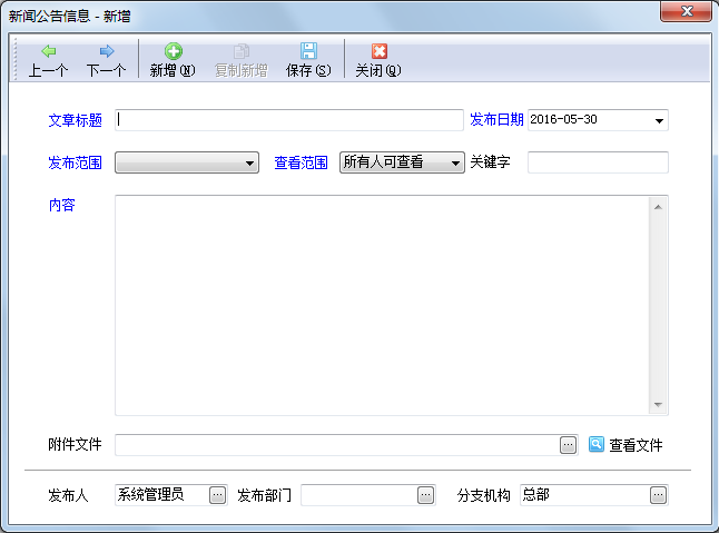 新增新聞公告:點擊工具欄的“新增”按鈕即可新增新聞公告,可以選擇“發布范圍”及“查看范圍”,發布在“內部”時,有查看權限的操作員登錄系統后即可查看到已發布的新聞公告,發布在“客戶服務平臺”時,客戶賬號在“訂貨管家”系統內可以查看到已發布的新聞公告。