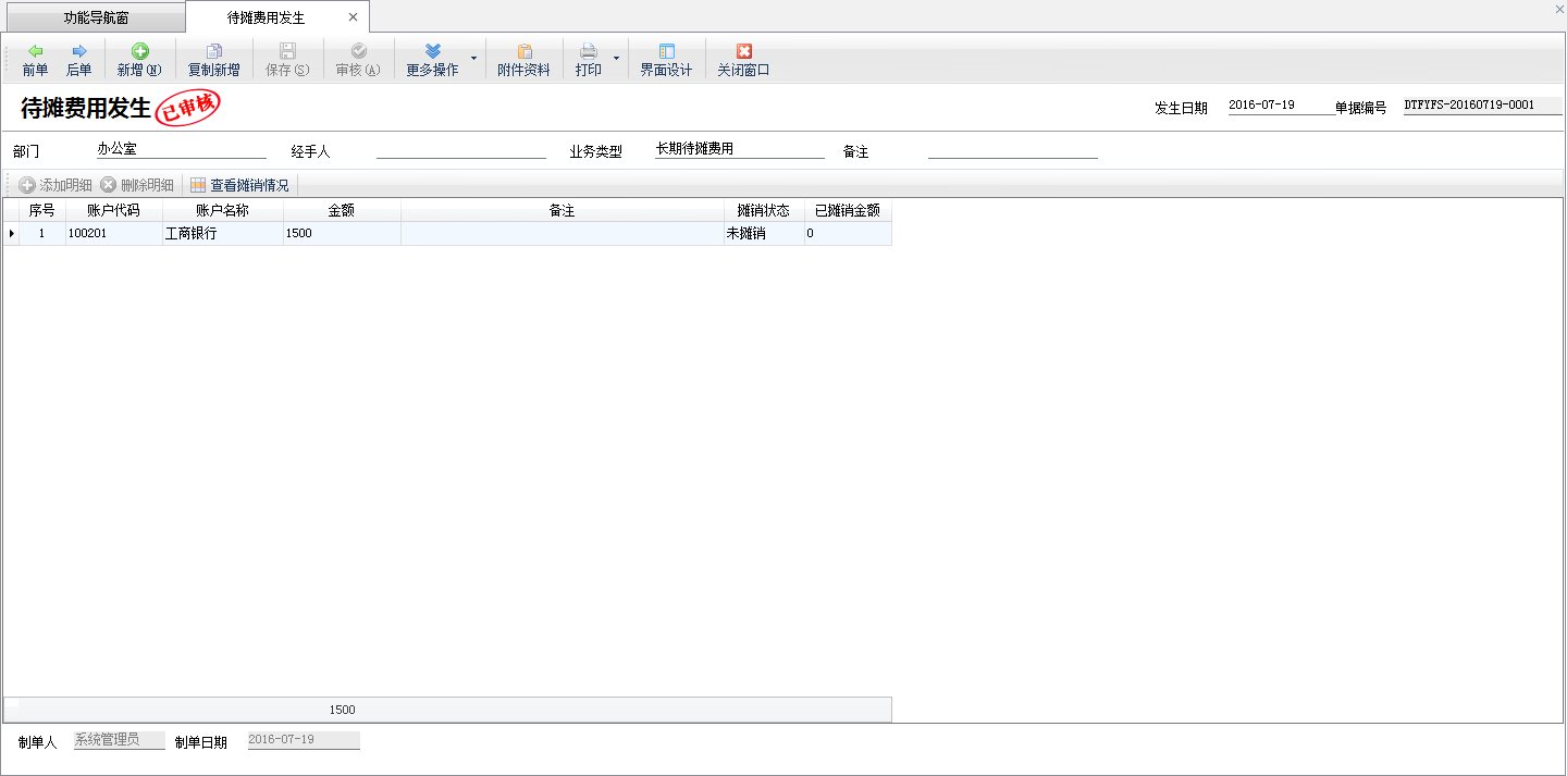 點(diǎn)擊“財(cái)務(wù)處理”—》“待攤費(fèi)用”—》“待攤費(fèi)用發(fā)生”,在“待攤費(fèi)用發(fā)生”功能中,錄入付款賬戶和付款金額,如果需要按部門核算也可以選擇相應(yīng)的部門。