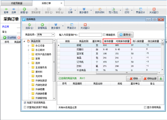 參數(shù)設(shè)置好后,在開單選擇商品明細(xì)時(shí)就可以查看到商品的庫存數(shù)量,以及可用庫存量。以采購訂單為例,選擇商品明細(xì)時(shí),商品界面顯示設(shè)置的參數(shù),如圖2所示: