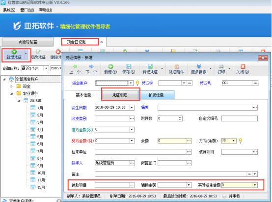 紅管家出納記賬軟件、亞拓管理軟件(標(biāo)準(zhǔn)版、專業(yè)版)中的出納管理模塊,在新增憑證中有的需要填寫輔助項目和憑證明細(xì),軟件支持設(shè)置在新增憑證時顯示這些項目。下邊以出納軟件為例,展示一下如何設(shè)置憑證顯示憑證明細(xì)和輔助項目項。
