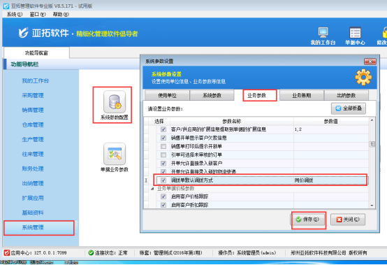 以亞拓管理軟件為例,首先設置參數,在導航窗“系統管理”->系統參數配置->選擇“業務參數”的“調撥單默認調撥方式”,后邊的參數值可選擇同價調撥或者變價調撥(示例選擇同價調撥)。勾選上此參數保存即可。具體如下圖: