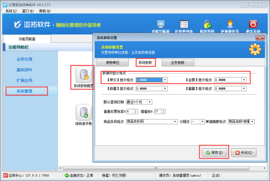 為滿足更多用戶可根據自身業務特點進行設置數據顯示格式的需求。亞拓管理軟件、紅管家送貨單軟件支持數據項顯示格式的設置。以送貨單軟件為例,示范如何設置。登錄軟件,在功能導航窗點“系統管理”—》“系統參數設置”即可進入“系統參數設置”界面,點擊“系統參數”,如圖1所示: