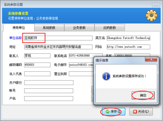 在“系統(tǒng)管理”—》“系統(tǒng)參數(shù)配置”中修改單位名稱為“亞拓軟件”,修改后記得保存。保存會提示“系統(tǒng)參數(shù)設(shè)置保存成功”。具體如下圖所示: