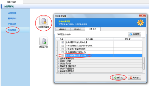 在功能導航窗點擊“系統管理”——》“系統參數配置”——》“業務參數”可以進入到“業務參數”配置界面,在業務單據明細參數內打勾啟用“業務單據明細數量允許為0”參數,如下圖一所示。