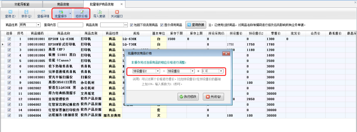 在批量維護(hù)商品信息界面工具欄點(diǎn)擊“批量操作”按鈕可以進(jìn)入批量操作模式,可以復(fù)選多個(gè)需要調(diào)價(jià)的商品信息,然后在工具欄點(diǎn)擊“修改價(jià)格”按鈕打開(kāi)“批量修改商品價(jià)格”窗口對(duì)已選擇的商品信息進(jìn)行批量調(diào)價(jià),比如:預(yù)設(shè)售價(jià)2在預(yù)設(shè)售價(jià)的基礎(chǔ)上提價(jià)10%,可以設(shè)置為“預(yù)設(shè)售價(jià)2=預(yù)設(shè)售價(jià)*1.1”,如下圖二所示。