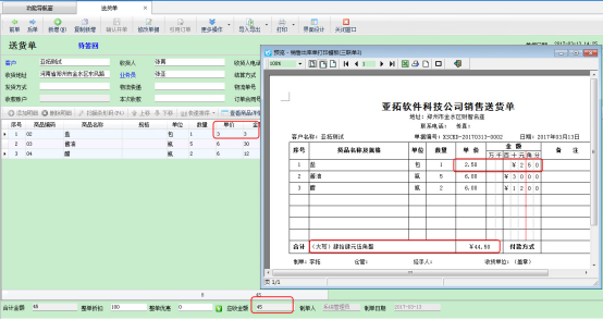 開一個送貨單單據(jù),單價、金額顯示格式設(shè)置不保留小數(shù)位(可參考此文章:送貨單軟件如何設(shè)置單價、金額的顯示格式?),打印預(yù)覽圖和單據(jù)界面如下圖所示: