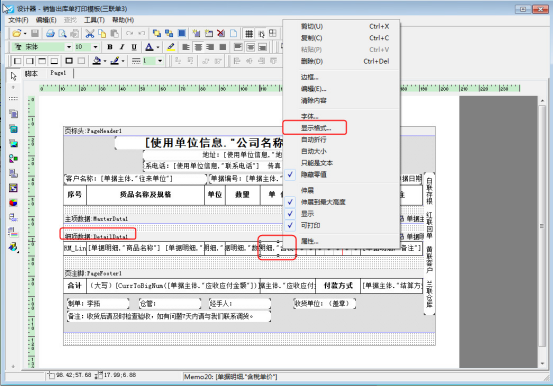 設(shè)置打印模板和單據(jù)界面一致,在開好的單據(jù)界面選擇“打印”—》“打印格式設(shè)計”—》“設(shè)計格式”,進入打印設(shè)計器界面,選擇細(xì)項數(shù)據(jù)的單價文本框,右鍵選擇“顯示格式”,如下圖所示: