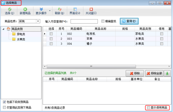 設(shè)置完成之后,新開一個單據(jù),添加商品明細進行選擇商品時,“選擇商品”窗口默認(rèn)不顯示已停用的商品,如圖2所示。