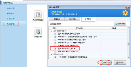功能導航欄選擇“系統管理”—》“系統參數配置”—》“業務參數”,勾選上“送貨單保存后可立即打印”,配置完成后點擊“保存”按鈕保存配置,如下圖1所示: