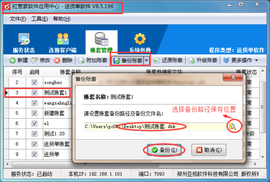 送貨單單機(jī)版更換電腦需要首先把原來(lái)的電腦做好備份工作,備份是在電腦的應(yīng)用中心(紅色圖標(biāo))上進(jìn)行操作。備份時(shí)可以選擇備份的保存路徑,為了更清晰的看到備份數(shù)據(jù)方便拷貝,可以把備份路徑更改為桌面。具體操作如下圖1所示: