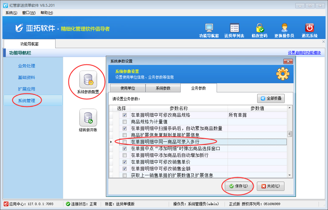 在功能導(dǎo)航窗點擊“系統(tǒng)管理”—》“系統(tǒng)參數(shù)配置”—》“業(yè)務(wù)參數(shù)”,即可進入到“業(yè)務(wù)參數(shù)”配置界面,在業(yè)務(wù)單據(jù)明細(xì)參數(shù)內(nèi)找到“在單據(jù)明細(xì)中同一商品可錄入多行”參數(shù),把這個參數(shù)的勾選去掉,然后保存,如下圖二所示。