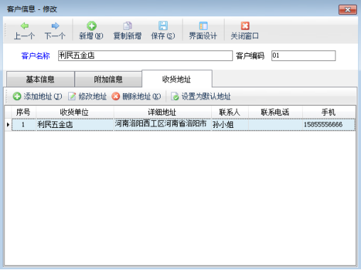 在功能導航窗點“基礎資料”—》“客戶信息”即可進入“客戶信息”界面,如圖1所示,點擊“修改”按鈕,打開客戶信息修改窗口,基本信息中的“詳細地址”就是開單默認地址,點擊“收貨地址”,可以維護其他的收貨地址信息。