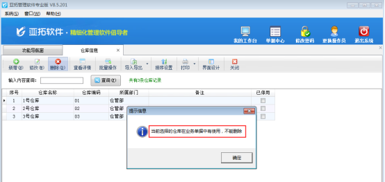 亞拓管理軟件紅管家倉庫管理軟件都可以對倉庫信息進行管理,如果有些倉庫在單據中已被使用,系統默認在單據中已使用過的倉庫信息是不能刪除的(如圖1所示),因為如果刪除,則會影響之前已使用此倉庫信息所開的業務單據,對于此種情況,我們可以將需要刪除的倉庫置為停用,已停用的倉庫無法被用于開單。如何把不用的倉庫設置為停用呢?本篇文章以亞拓管理軟件專業版為例詳細介紹一下如何把倉庫設置為停用狀態。