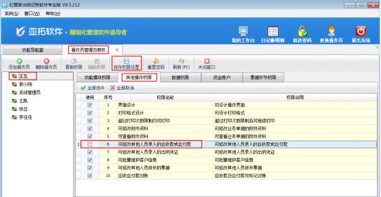 在功能導(dǎo)航窗點“系統(tǒng)管理”→“操作員及授權(quán)”即可進入“操作員管理及授權(quán)”界面,選中操作員賬號,在“其他操作權(quán)限”界面將“可修改其他人員錄入的應(yīng)收款或應(yīng)付款”權(quán)限打鉤取消,如下圖1所示,設(shè)置操作員賬號“王五”不可修改其他人員錄入的應(yīng)收款或應(yīng)付款。