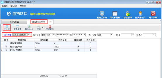 在“日記賬綜合統(tǒng)計(jì)”界面,統(tǒng)計(jì)類型選擇“按核算項(xiàng)目統(tǒng)計(jì)”,然后點(diǎn)擊“統(tǒng)計(jì)”按鈕,可以根據(jù)核算項(xiàng)目進(jìn)行統(tǒng)計(jì)。另外,系統(tǒng)支持根據(jù)日期、賬戶名稱、部門、經(jīng)手人等條件進(jìn)行統(tǒng)計(jì)查詢。