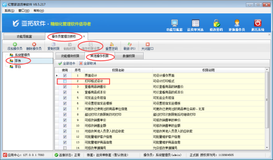 亞拓軟件自主研發的亞拓管理軟件紅管家送貨單軟件紅管家票據打印軟件紅管家倉庫管理軟件都支持自定義設計打印模板,打印模板設計完成后,為了避免操作員修改錯打印模板,軟件可以設置操作員的打印模板設計權限。(系統管理員默認具有所有權限,不允許修改)。