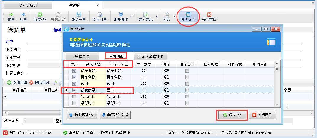 商品的客戶最近價設置完成后,我們在功能導航窗點擊“業務處理”——》“新開送貨單”,打開新增送貨單界面,在“界面設計”—》“單據明細”內將系統參數配置中配置的參數值“擴展信息1”自定義列名修改為“型號”,然后將此數據項配置顯示出來,如下圖四所示。