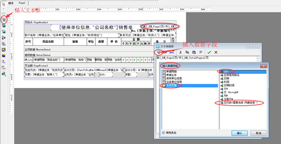 打開模版設計界面后,在模版合適的位置添加一個文本框,雙擊文本框打開文本編輯器,然后錄入內(nèi)容“第[_RM_Page]頁/共[_RM_TotalPages]頁”或者是通過“插入數(shù)據(jù)字段”插入頁碼,如下圖三、圖四所示。