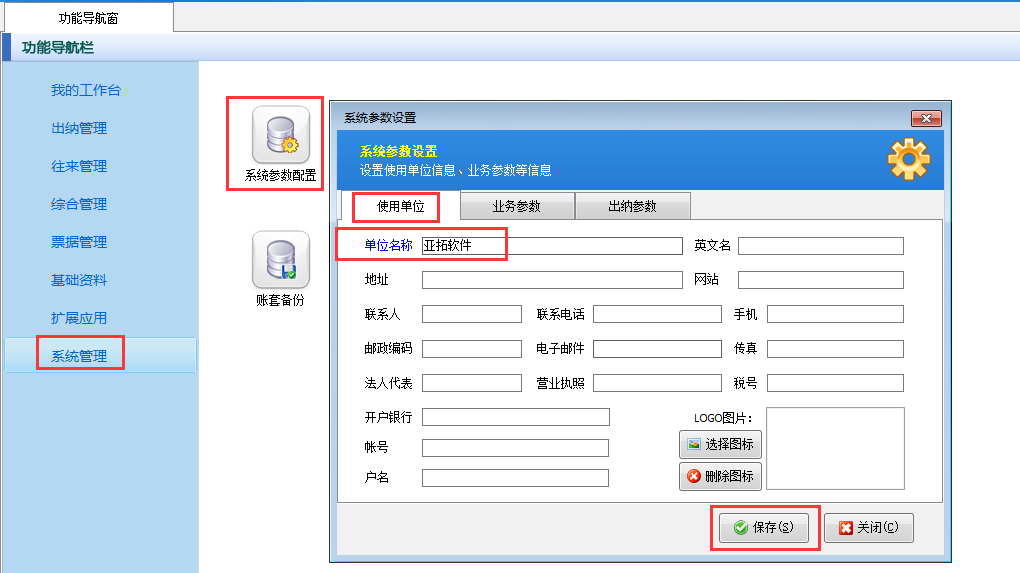 登錄軟件,在左側功能導航窗點擊“系統管理”—》“系統參數配置”打開系統參數配置窗口,然后在“使用單位”標簽頁修改“使用單位名稱”及相關信息即可,如下圖三所示:
