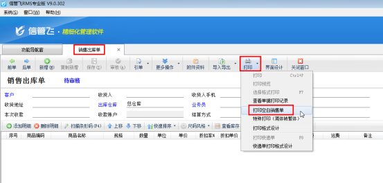 信管飛RMS、信管飛送貨單軟件、信管飛倉庫管理軟件開單后可以直接打印單據(jù),另外軟件還支持打印空白銷售單,以滿足部分客戶打印空白銷售單的需求。下面我們以信管飛RMS專業(yè)版為例介紹一下打印空白銷售單的具體的操作步驟。