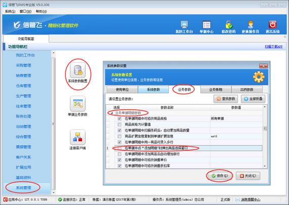 在功能導航窗點擊“系統管理”—》“系統參數配置”—》“業務參數”,即可進入到“業務參數”配置界面,在業務單據明細參數內找到“在單據中點擊‘添加明細’時彈出商品選擇窗口”參數,把這個參數的勾選去掉,然后保存,如下圖二所示。