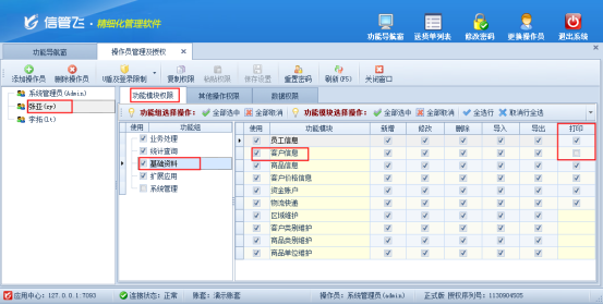 信管飛送貨單軟件信管飛RMS信管飛倉庫管理軟件等都支持管理基礎資料信息和允許設置多個操作員進行登錄軟件。軟件支持對基礎資料信息可以直接打印,為避免操作員打印客戶資料,本文以信管飛送貨單軟件為例,示范下如何設置操作員不可打印客戶信息。