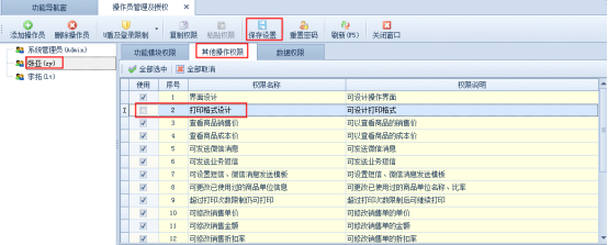 此處設置好后,點擊“其他操作權(quán)限”,把“打印格式設計”權(quán)限取消勾選,保存操作員權(quán)限,如下圖2所示: