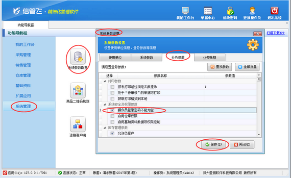 在功能導(dǎo)航窗點(diǎn)擊“系統(tǒng)管理”→“系統(tǒng)參數(shù)設(shè)置”→“業(yè)務(wù)參數(shù)”可以打開“業(yè)務(wù)參數(shù)”配置界面,在系統(tǒng)安全及權(quán)限參數(shù)內(nèi)打鉤啟用“操作員登陸密碼不能為空”參數(shù),然后點(diǎn)擊“保存”按鈕保存設(shè)置,如下圖一所示。