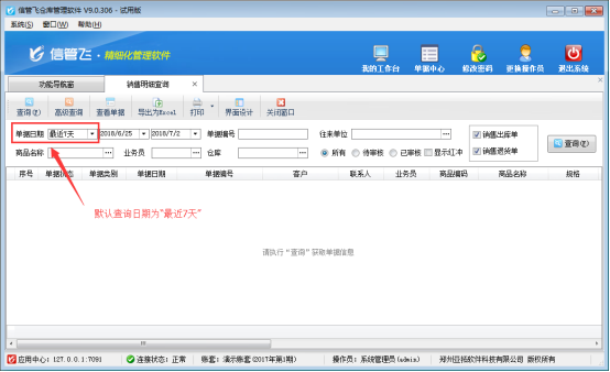 信管飛倉庫管理軟件信管飛RMS軟件等軟件內都包含統計查詢功能(采購單列表、銷售單列表、采購單明細查詢、銷售單明細查詢等統計查詢報表),軟件內統計查詢報表默認查詢日期是“最近7天”如下圖1所示,如需要修改默認查詢日期,該如何修改呢?下邊以“信管飛倉庫軟件軟件”為例示范如何修改默認查詢日期。