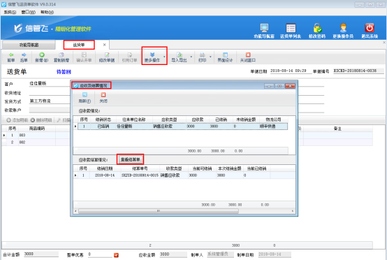 打開一個(gè)送貨單,點(diǎn)擊“更多操作”—》“查看應(yīng)收款及結(jié)銷情況”,系統(tǒng)會(huì)彈出“應(yīng)收及結(jié)算情況”窗口,如下圖1、圖2所示:
