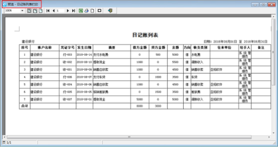 在日記賬列表界面點擊“查看賬簿”,進入銀行賬簿界面,在銀行賬簿界面,點擊打印按鈕下的打印可以直接把當前銀行賬簿信息進行打印出來,打印預覽圖如下: