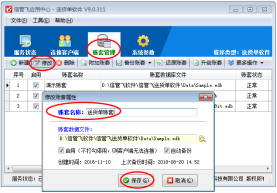 以“信管飛送貨單軟件”為例,示范下如何修改賬套的名稱。打開紅色的應(yīng)用中心程序(應(yīng)用中心運(yùn)行后桌面右下角會(huì)顯示相應(yīng)的圖標(biāo),點(diǎn)擊即可打開應(yīng)用中心主界面),在賬套管理界面,點(diǎn)擊賬套后選擇工具欄中的“修改”按鈕,彈出“修改賬套屬性”界面,把“演示賬套”修改為“送貨單賬套”,然后點(diǎn)擊“保存”按鈕,如下圖1所示: