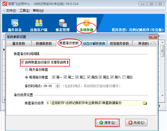 首先打開軟件應(yīng)用中心主界面,點擊“系統(tǒng)參數(shù)”—》“賬套備份參數(shù)”,可以打開賬套備份參數(shù)界面,賬套備份參數(shù)內(nèi)可設(shè)置是否啟用自動備份、備份時間間隔和備份目錄,如圖1所示: