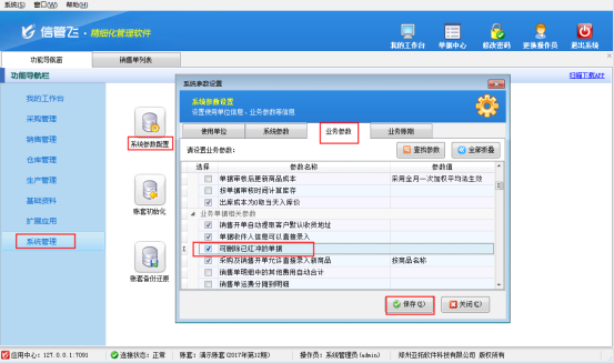在功能導航窗選擇系統管理”—》“系統參數配置”—》“業務參數”中“可刪除已紅沖的單據”默認是沒有打勾選擇的,可以把“可刪除已紅沖的單據”打勾選擇上,然后保存即可。如下圖所示: