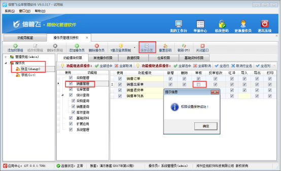 在功能導(dǎo)航窗選擇“系統(tǒng)管理”—》“操作員及授權(quán)”,進(jìn)入“操作員及授權(quán)管理界面”,選擇操作員組的操作員“張亞”,在其右側(cè)的功能設(shè)置權(quán)限,把銷(xiāo)售出庫(kù)單的“審核”權(quán)限取消勾選,然后點(diǎn)擊保存設(shè)置,如下圖所示: