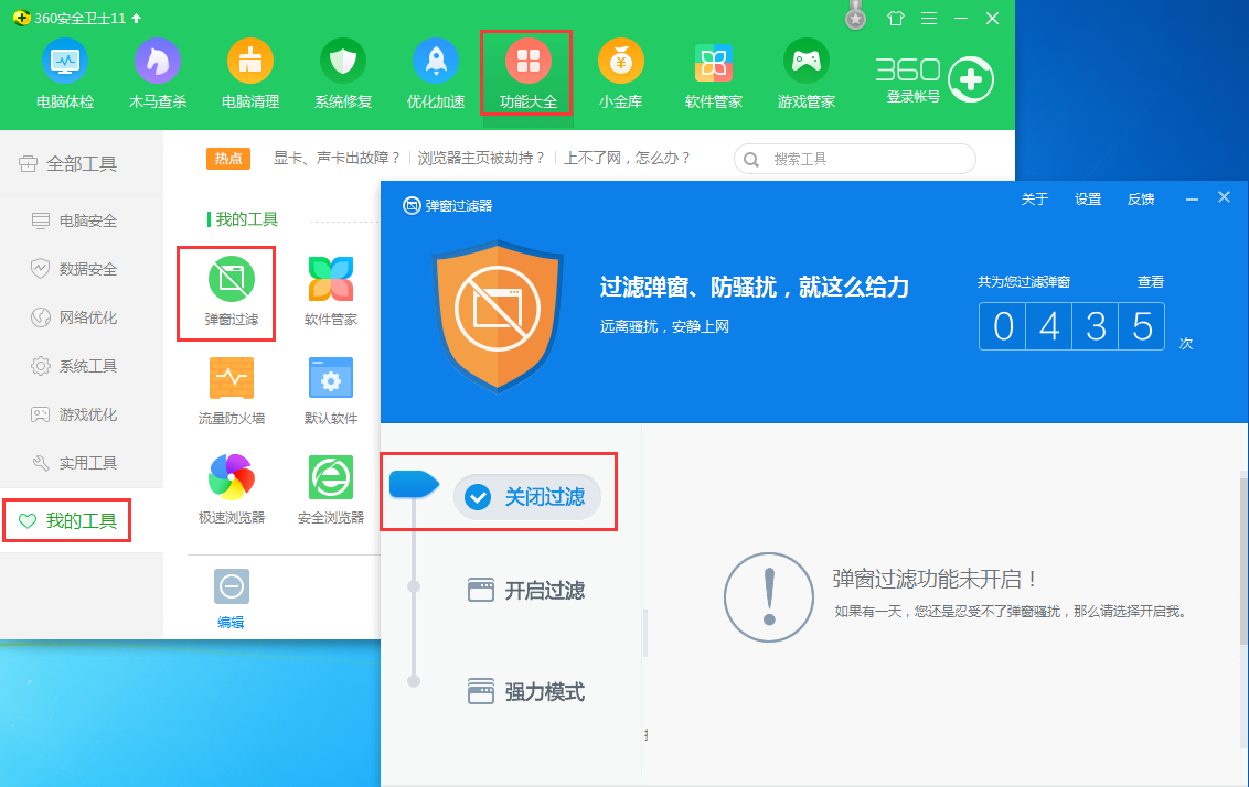 打開(kāi)360安全衛(wèi)士,在“功能大全”—》“我的工具”內(nèi)找到“彈窗過(guò)濾”工具打開(kāi)彈窗過(guò)濾器,點(diǎn)擊“關(guān)閉過(guò)濾”即可。