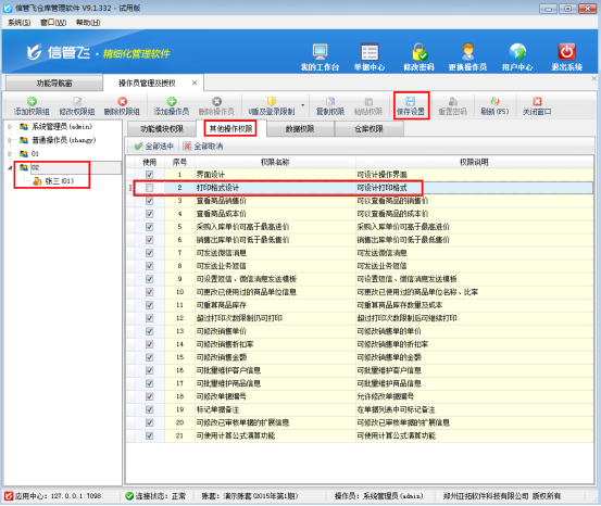 以信管飛倉庫管理軟件為例,介紹一下如何控制操作員的打印模板設(shè)計(jì)權(quán)限。在功能導(dǎo)航窗,選擇“系統(tǒng)管理”—》“操作員及授權(quán)”,選擇操作員“張三”,然后在“其他操作權(quán)限”中把“打印格式設(shè)計(jì)”權(quán)限前的勾選符號取消,然后點(diǎn)擊“保存設(shè)置”,如下圖1所示: