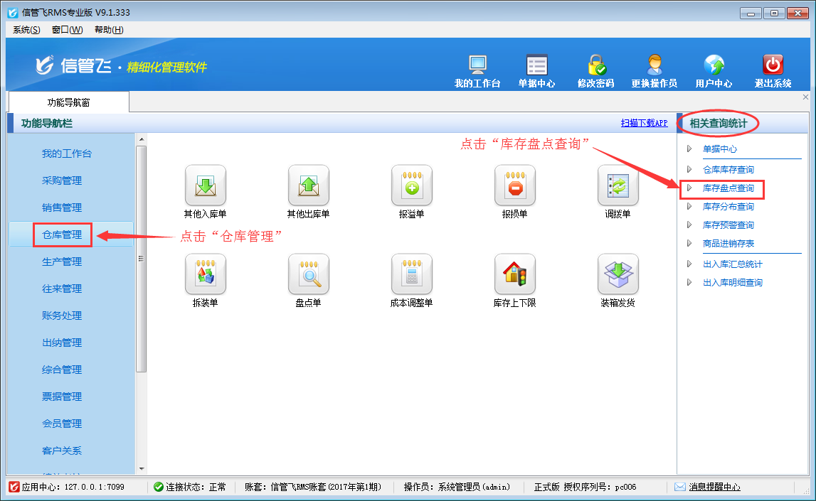 信管飛RMS信管飛倉庫管理軟件都可以對倉庫信息進行管理,都可以查詢商品實時庫存和歷史庫存數量。倉庫庫存查詢可以查看存貨的實時庫存情況,庫存盤點查詢可以按照指定的盤點日期查詢截止到盤點日期之前不同倉庫內存貨的庫存數量,包括庫存數量、可用庫存數量、待入庫數量、待出庫數量,并可查看庫存成本情況,支持按照倉庫、商品性質等條件進行匯總。本篇文章以信管飛RMS專業版為例詳細介紹一下如何查詢商品歷史庫存數量。