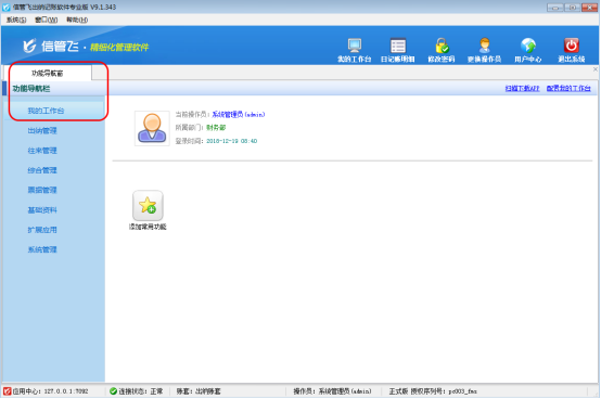 亞拓軟件開發的信管飛出納記賬軟件、信管飛RMS、信管飛倉庫管理軟件、信管飛票據打印軟件等都包含我的工作臺功能,我的工作臺中可以查看當前操作員信息,并且可以添加一些常用的功能模塊。下面我們以信管飛出納記賬軟件專業版為例詳細介紹下我的工作臺功能是如何使用的。