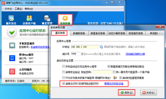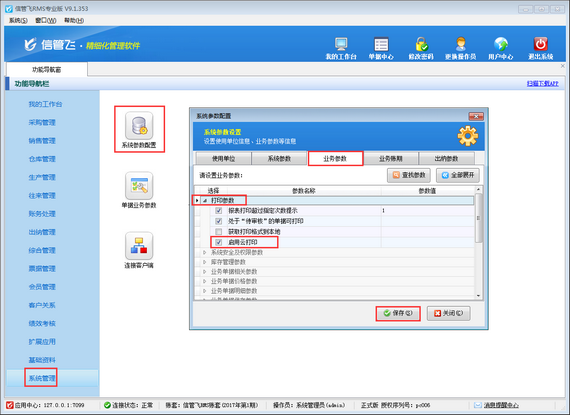 云打印機設備設置完成后,登錄軟件,需要設置云打印參數,在功能導航窗點擊“系統管理”->“系統參數設置”->“業務參數”打開業務參數設置窗口,在“打印參數”內打鉤啟用“啟用云打印”參數,然后點擊“保存”按鈕保存設置,如下圖三所示。