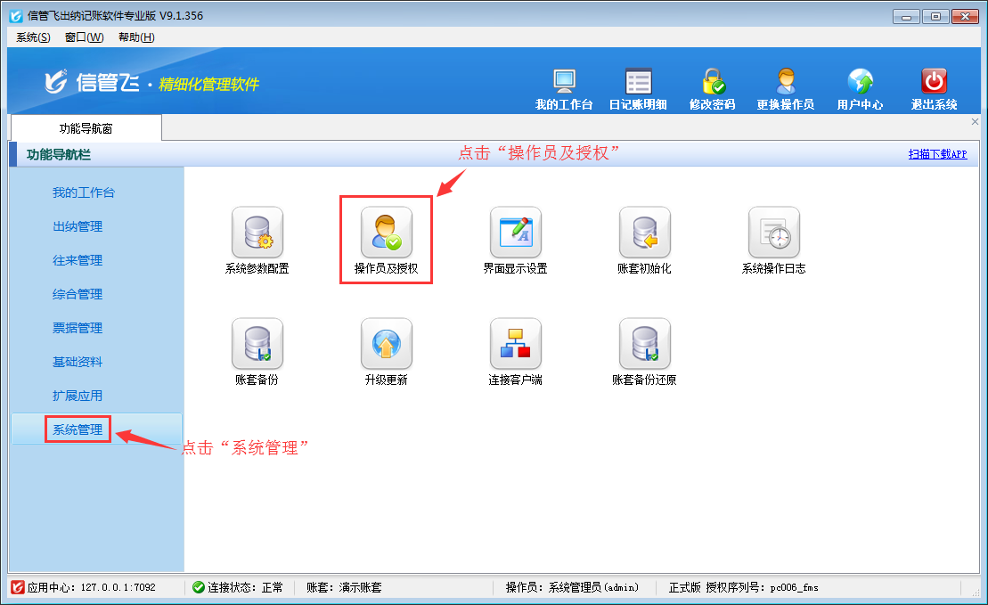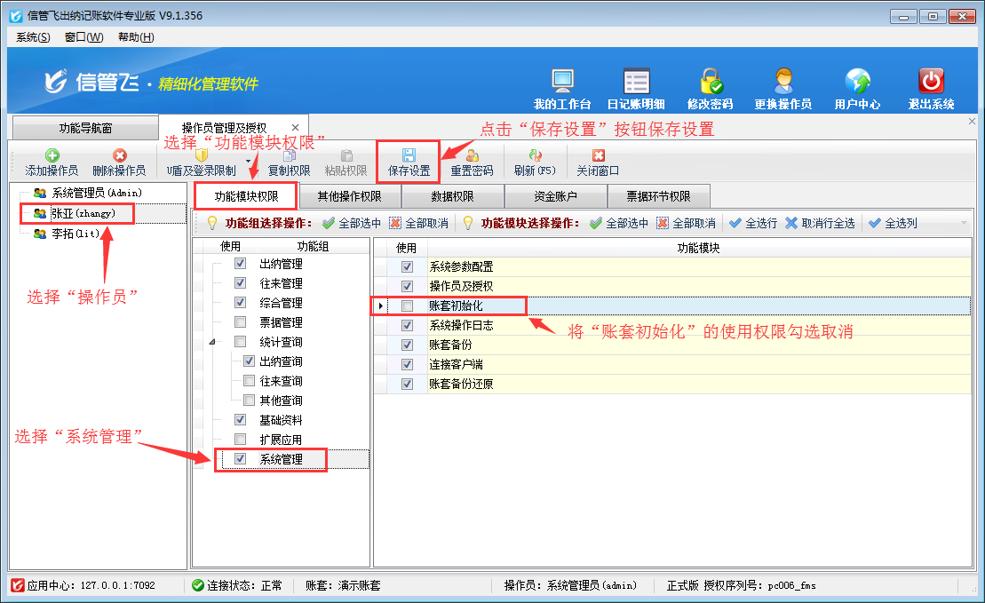 執(zhí)行賬套初始化操作后,會刪除賬套內相應的數(shù)據(jù),因此務必提前做好備份,謹慎操作!為了避免操作員誤操作,導致數(shù)據(jù)丟失,軟件內支持設置操作員不可進行賬套初始化操作,下面以信管飛出納記賬軟件專業(yè)版為例來演示一下具體的操作步驟。