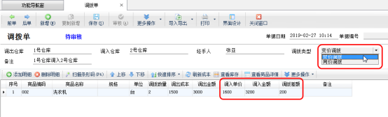 ②選擇調撥類型后,下面的單據明細會自動切換需要輸入的數據項(調入單價、調入金額、調撥差額)。