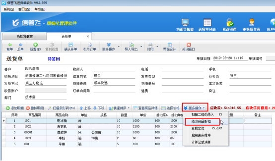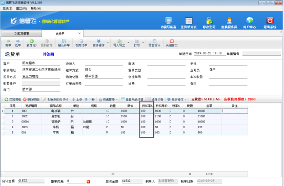 信管飛送貨單軟件信管飛倉庫管理軟件信管飛RMS開單時,當商品存在打折情況時,支持錄入商品的折扣率。當商品明細的內容比較多時,為了快速開單,提高效率,可以批量更新單據明細中的折扣率。