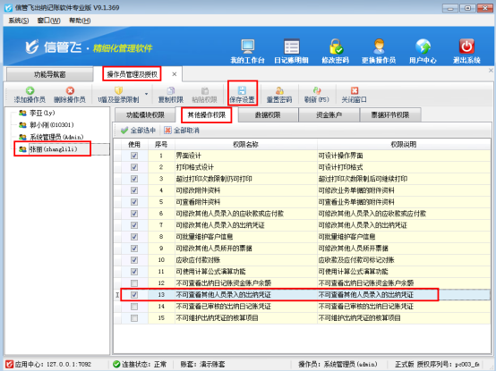 注意:設置操作員不可查看其他人員錄入的出納憑證的權限為V9.1.369版本增加的功能,如需要使用此功能,需升級到最新版。