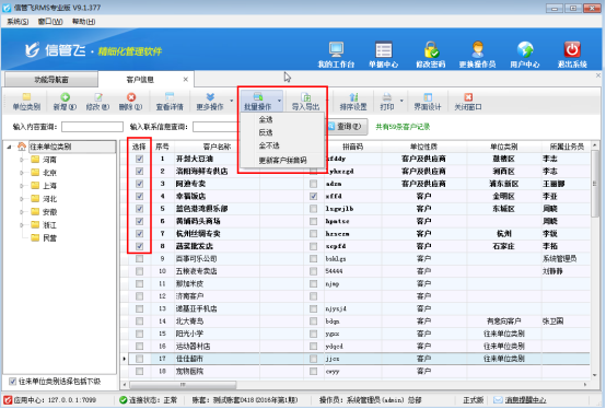 在功能導航窗選擇“基礎資料”—》“客戶信息”進入客戶信息管理界面,選擇工具欄的“批量操作”按鈕,進入批量操作模式,選擇需要刪除的客戶信息(批量操作支持全選、全不選、反選),如下圖所示: