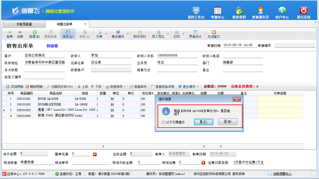 信管飛RMS、信管飛倉庫管理軟件、信管飛送貨單軟件等在業務單據保存時如果商品單價為0,系統會彈出提示信息,是否需要繼續保存,如下圖一所示,這樣以免用戶在添加商品明細時忘了填寫單價,好及時錄入,但是有一部分用戶在開單據時只需要填寫商品數量,不需要填寫單價,該怎么設置系統才能不彈出以下提示信息呢?本篇文章以信管飛RMS專業版為例介紹一下如何設置出庫單保存時商品單價為0系統不彈出提示信息?