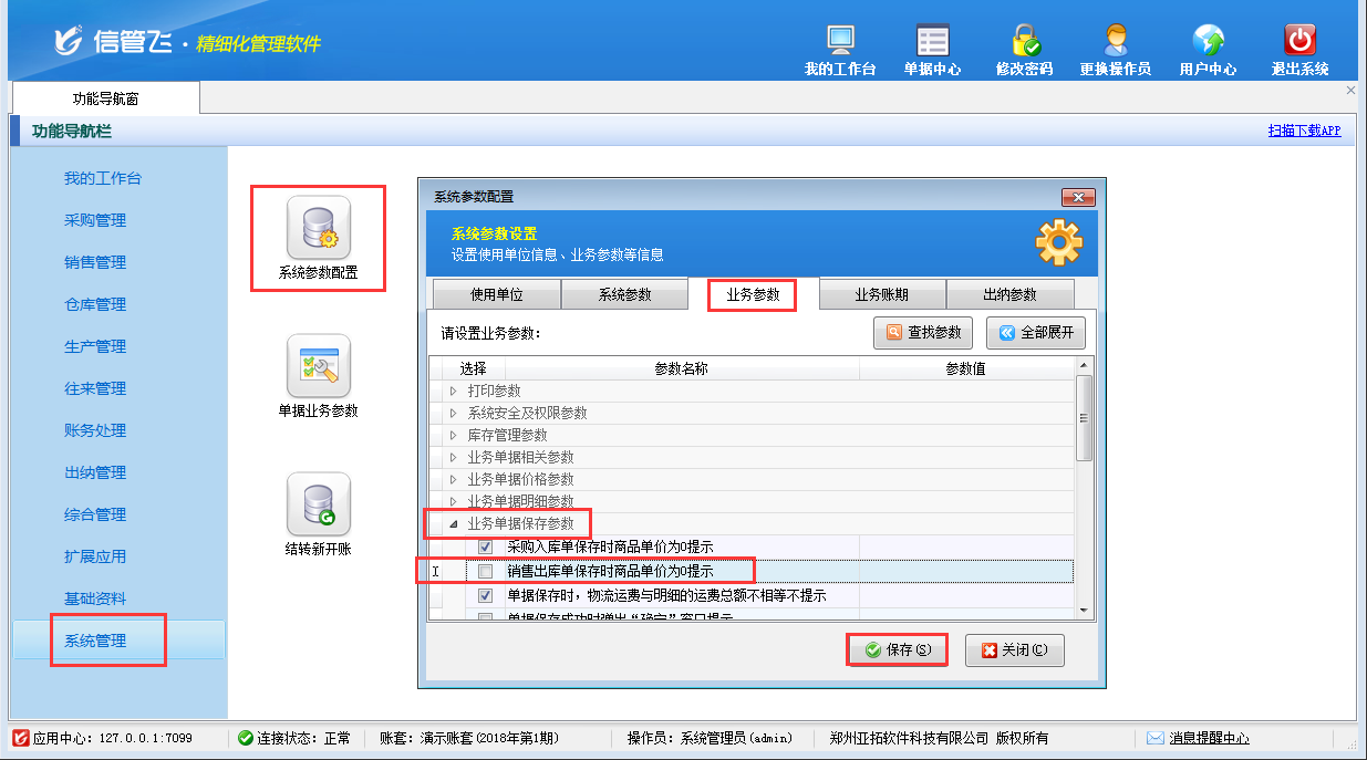 在功能導航窗點擊“系統管理”—》“系統參數配置”—》“業務參數”,即可進入到“業務參數”配置界面,在業務單據保存參數內找到“銷售出庫單保存時商品單價為0提示”參數,把這個參數的勾選去掉,然后保存設置,如下圖二所示。